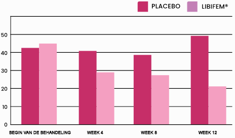 De grafiek toont de effectiviteit van Libifem® bij het verminderen van opvliegers en nachtelijk zweten (totaal aantal over een periode van 7 dagen). Na 4 weken is een duidelijke verbetering merkbaar.